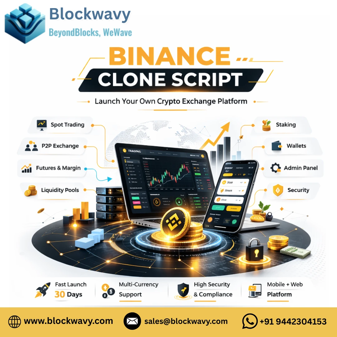 High-TPS Infrastructure for Global Trading Launch a professional exchange with Blockwavy’s Binance clone script. Our platform features a high-performance matching engine, deep liquidity integration, and a sleek user interface designed for 2026 market demands. Build a scalable, white-label trading ecosystem that handles millions of transactions with zero latency. Scale your vision with Blockwavy. 👇 Web: https://www.blockwavy.com/binance-clone-script Email: sales@blockwavy.com Call/ Whatsapp: +91 9442304153