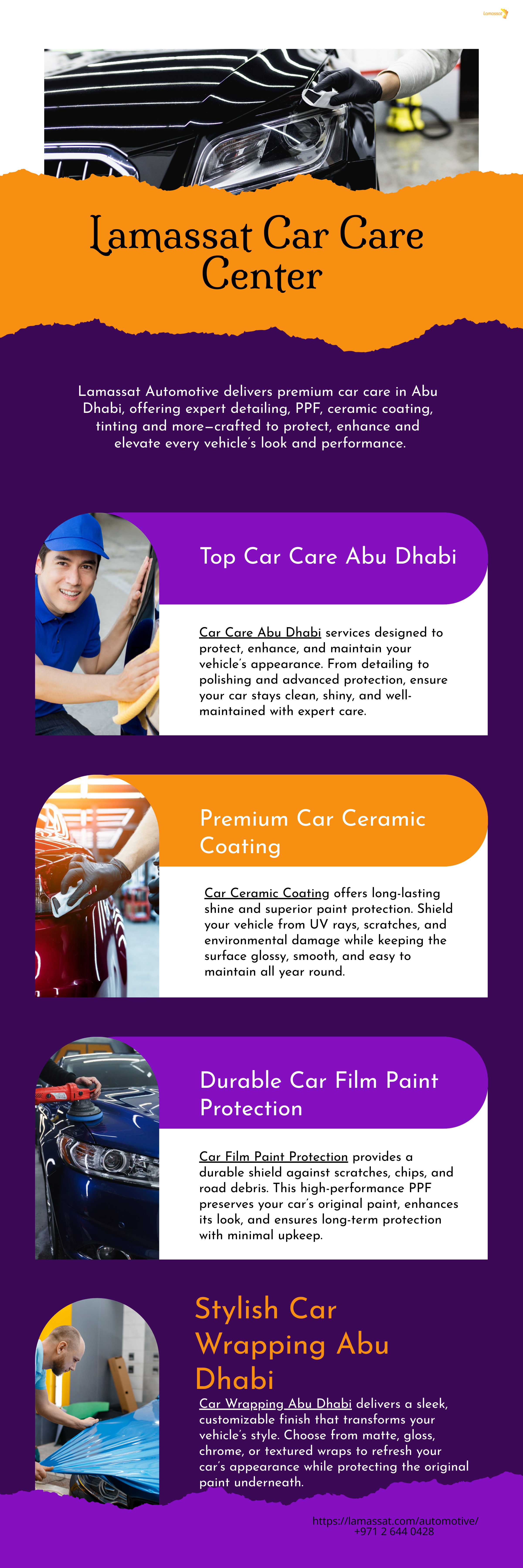 • Shine & Shield: Premium Auto Care at Lamassat Abu Dhabi Lamassat’s automotive division in Abu Dhabi offers elite Car Care Abu Dhabi solutions designed to protect, enhance, and personalize your vehicle with world-class craftsmanship. From eye-catching Car Wrapping Abu Dhabi services that transform your vehicle’s look without a repaint to advanced Car Film Paint Protection installations, Lamassat ensures your car stays flawless in both appearance and performance. Their expert team specialises in durable PPF Car Protection systems that shield your paintwork from scratches, chips, UV rays, and everyday wear, helping maintain your car’s pristine condition and resale value. Beyond film, Lamassat also provides high-end Car Ceramic Coating and Nano Ceramic Coating treatments that deliver a hydrophobic, glossy finish while protecting surfaces from environmental contaminants and making maintenance easier. With meticulous attention to detail, premium materials, and a passion for automotive excellence, Lamassat is a top choice for comprehensive car protection and styling in Abu Dhabi. #CarWrappingAbuDhabi #CarCareAbuDhabi #CarFilmPaintProtection #PPFCarProtection #CarProtectionFilm #CarCeramicCoating #NanoCeramicCoating