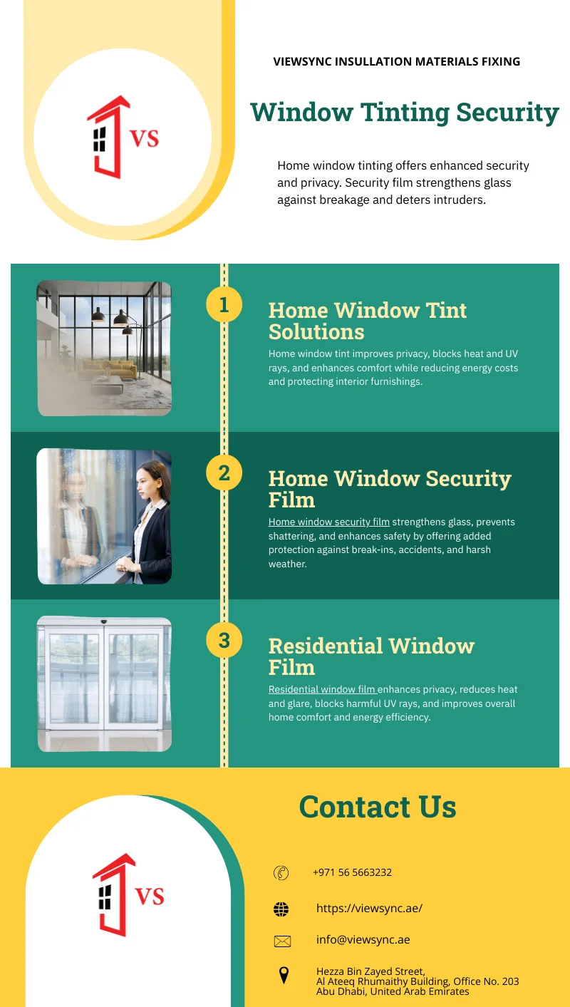 VIEWSYNC INSULLATION MATERIALS FIXING, headquartered in Abu Dhabi, has proudly served the Emirates for nearly two decades. Specializing in premium building supplies, we offer a wide range of innovative solutions, including Smart Film Abu Dhabi, Switchable Smart Glass, Home Window Security Film, Decorative Glass Film for Windows, Heat Rejection Window Film Abu Dhabi, and Solar and Safety Window Film. Our services extend from residential and commercial recommendations to expert-led courses on the application of architectural glass and films. We are dedicated to providing full technical and backup support while excelling in the design, manufacturing, sales, and marketing of high-quality products across the UAE.Enhance comfort and security with premium Window Tint for Home, Home Window Security Film, and Residential Window Film in Abu Dhabi. https://viewsync.ae/home-window-film-abu-dhabi