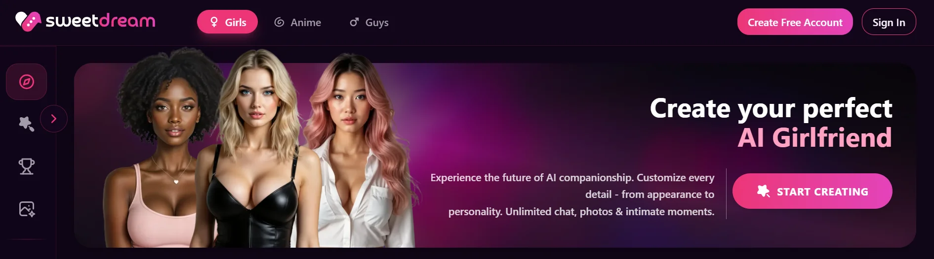 Discover your perfect AI girlfriend on SweetDream AI Chat, featuring realistic AI girlfriend and AI boyfriend experiences powered by advanced AI anime technology. Chat freely, build meaningful virtual relationships, and personalize your ideal companion. Create stunning AI images and videos, explore immersive conversations, and enjoy free AI girlfriend chat anytime.