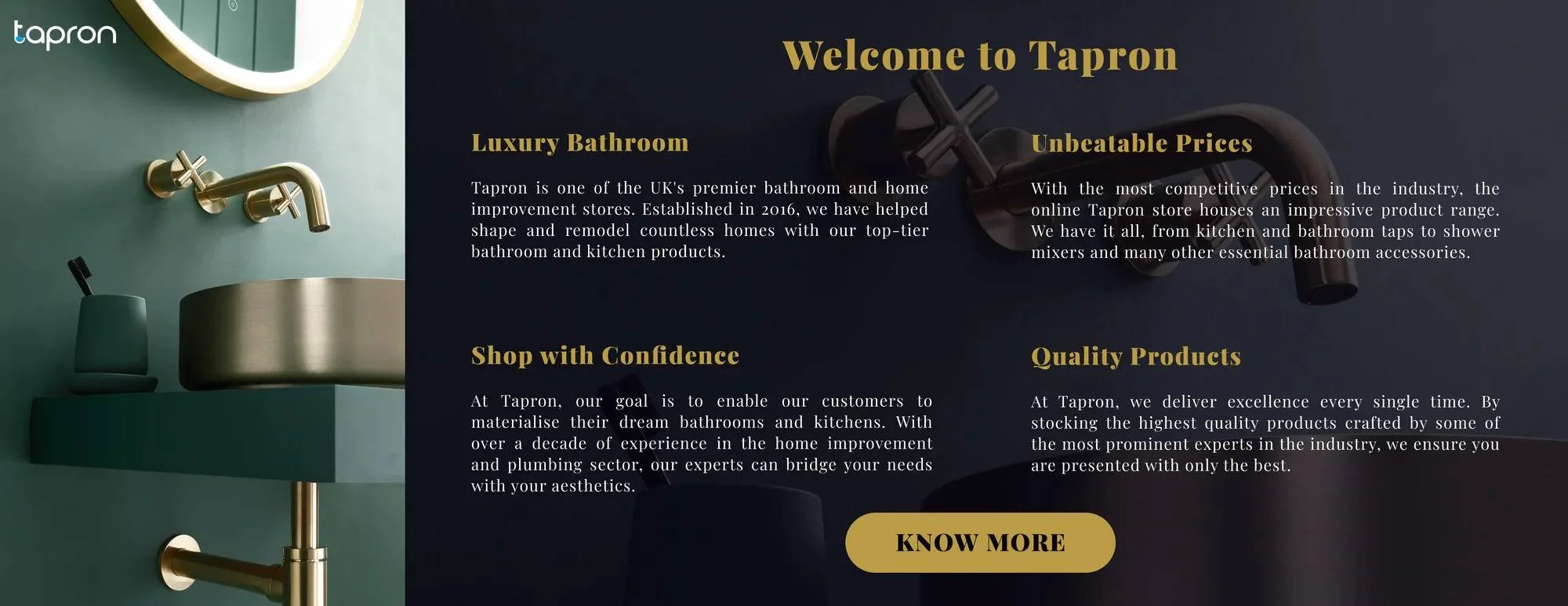 Tapron is a UK-based retailer that specialises in luxury bathroom and kitchen fittings, offering a wide range of products that combine contemporary design with lasting quality. Their collection includes bathroom taps, showers, towel radiators, basins, toilets, and furniture, as well as stylish kitchen taps and accessories. Each product is crafted with attention to detail, using durable materials and modern finishes such as brushed brass, matte black, and polished chrome to suit a variety of interior styles.